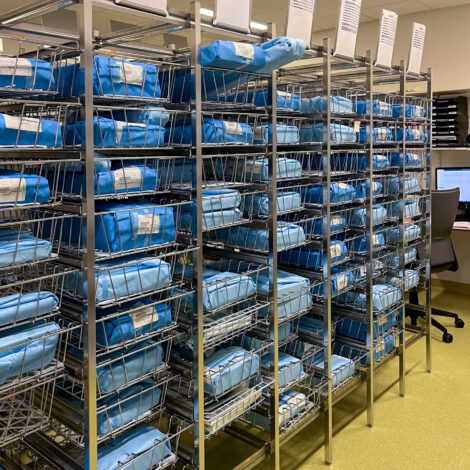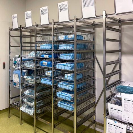 De kleine steriele opslagruimte lijkt nu ruimtelijker dan voorheen, dankzij de slanke vormgeving van de stellingen.