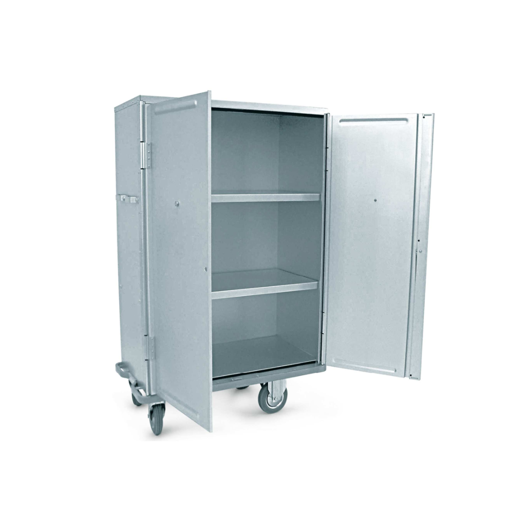 De legplanken zijn uitneembaar en kunnen verticaal tegen achterwand vastgezet worden, maar de legplanken zijn niet verstelbaar. De transportwagen is door middel van twee invallende 270° wendbare vleugeldeuren afsluitbaar welke bij het openen vastgezet kunnen worden door middel van magneten aan weerszijden. Daarnaast is de transportwagen voorzien van een omlopende stootrand onder en duwbeugels aan de kopse zijdes. Standaard voorzien van verzinkte wielen Ø200mm waarvan twee bokwielen en twee zwenkwielen geremd.