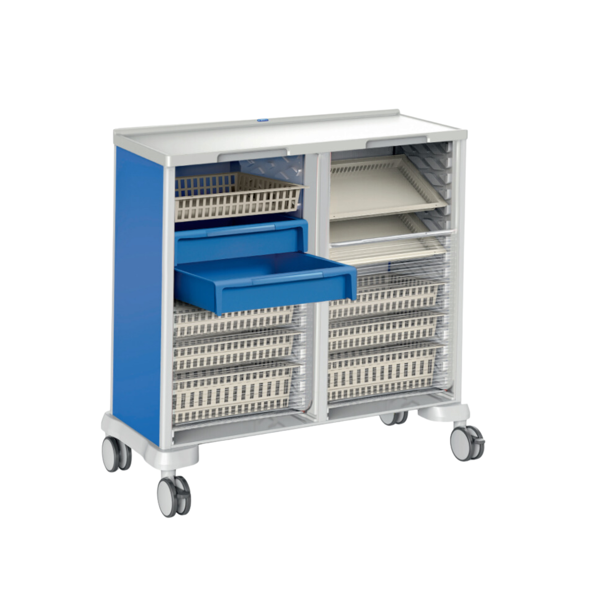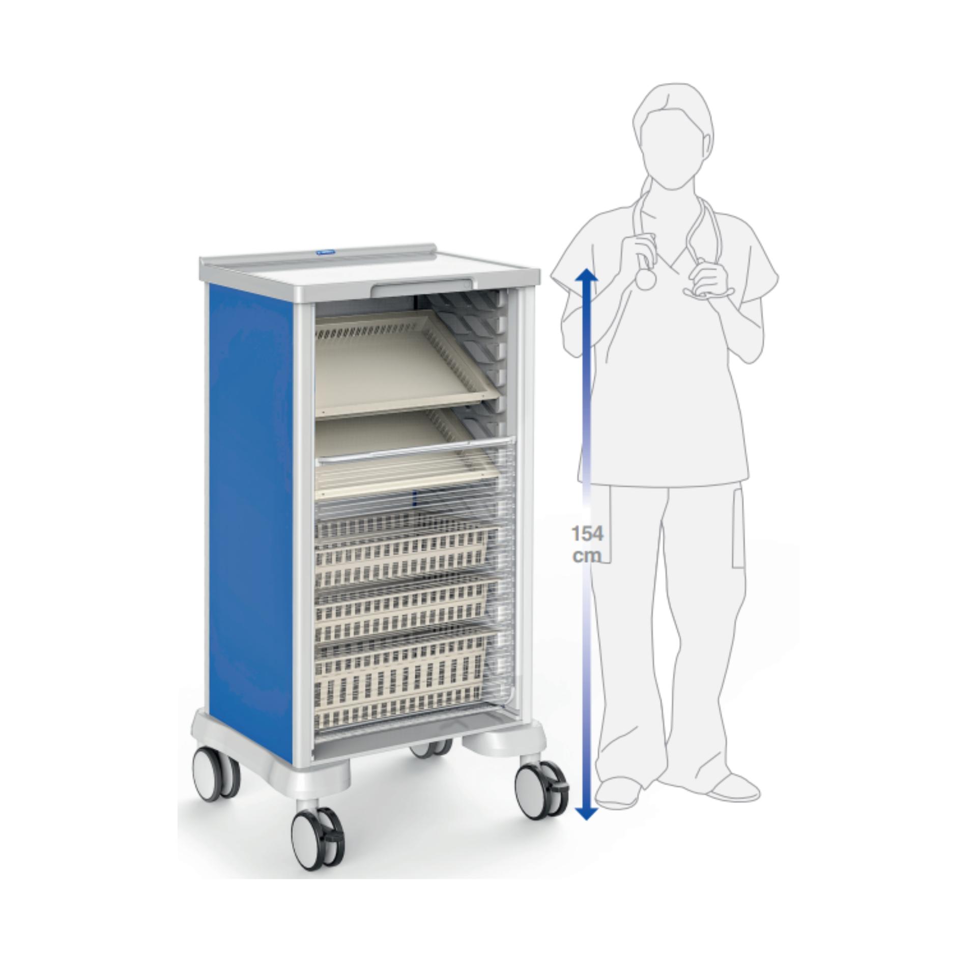 Dit model kastwagen, met een hoogte van 1540 mm, is ideaal in gebruik en erg gemakkelijk verrijdbaar. Daarnaast biedt deze de nodige opslag en is dit model ook beschikbaar in een dubbele breedte en dus ook een dubbele hoeveelheid opslagruimte; zie afbeeldingen voor voorbeelden.