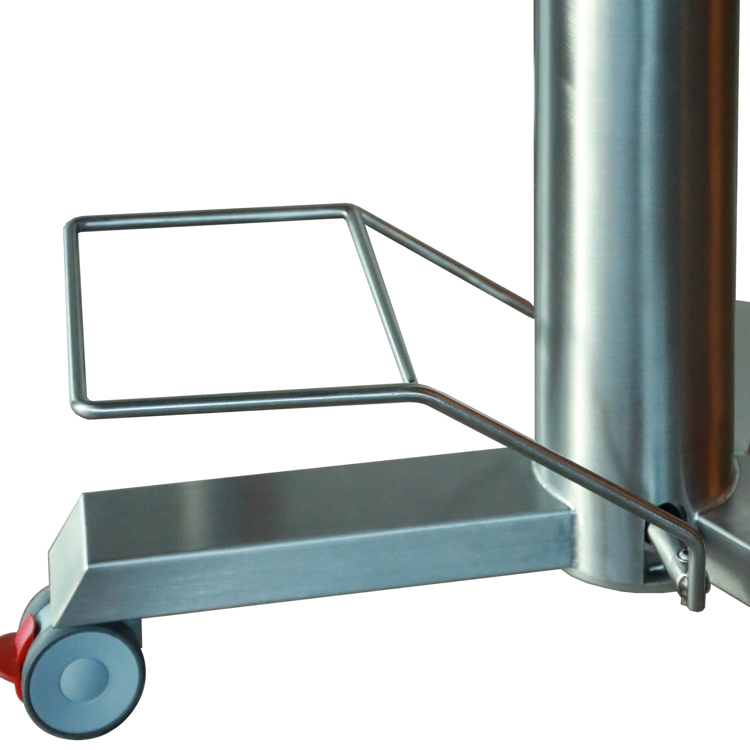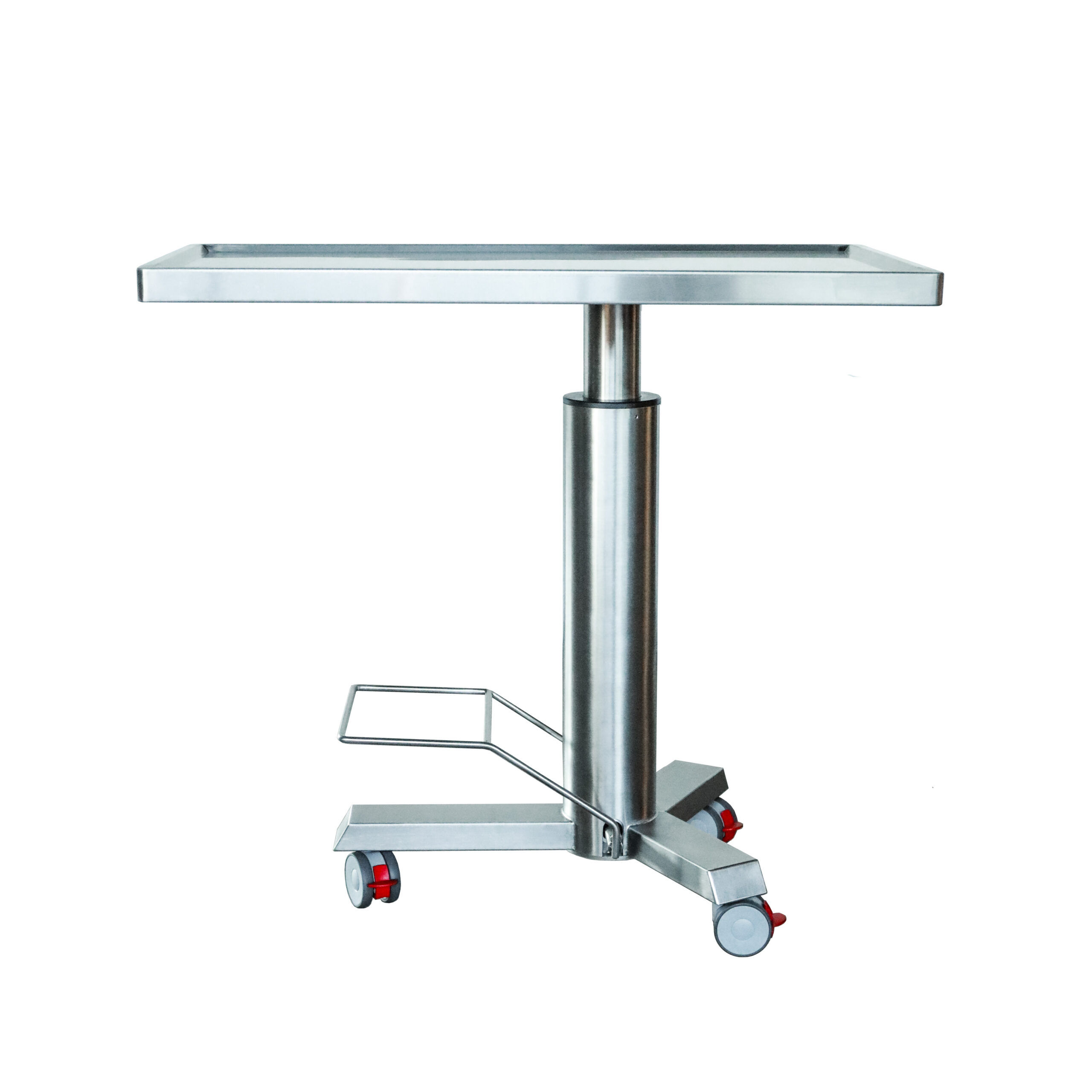 De tafel is uitgevoerd met een robuust T-frame en voorzien van 3 zwenkwielen ⌀ 75, alledrie geremd. De overzettafel maakt het dus mogelijk om een steriel werkveld te creëren nabij de patiënt. Door middel van de voetbediening is de tafel in hoogte te verstellen, hierbij wordt voorkomen dat het steriele werkveld hoeft te worden aangeraakt. Onder het blad is een extra kokerprofiel aangebracht voor stabiliteit en draagkracht van het blad.