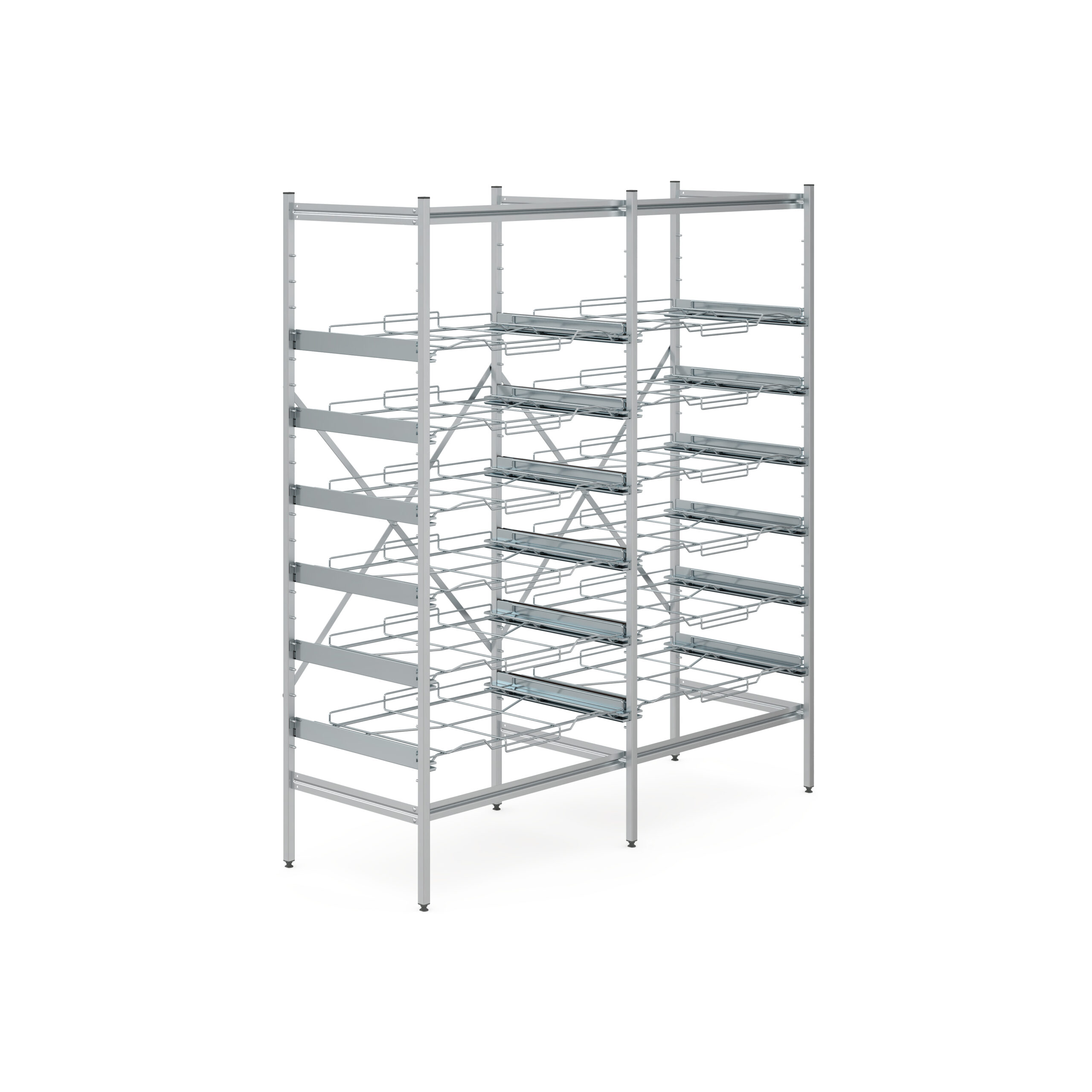 De rekken voor de draadmanden zijn gemaakt van RVS en zijn geschikt voor een opslag van 6 da-Vinci® draadmanden. Daarnaast zijn deze voorzien van ergonomische inschuifbare framesets, die ervoor zorgen dat de draadmand altijd bereikbaar is en gemakkelijk te hanteren is.