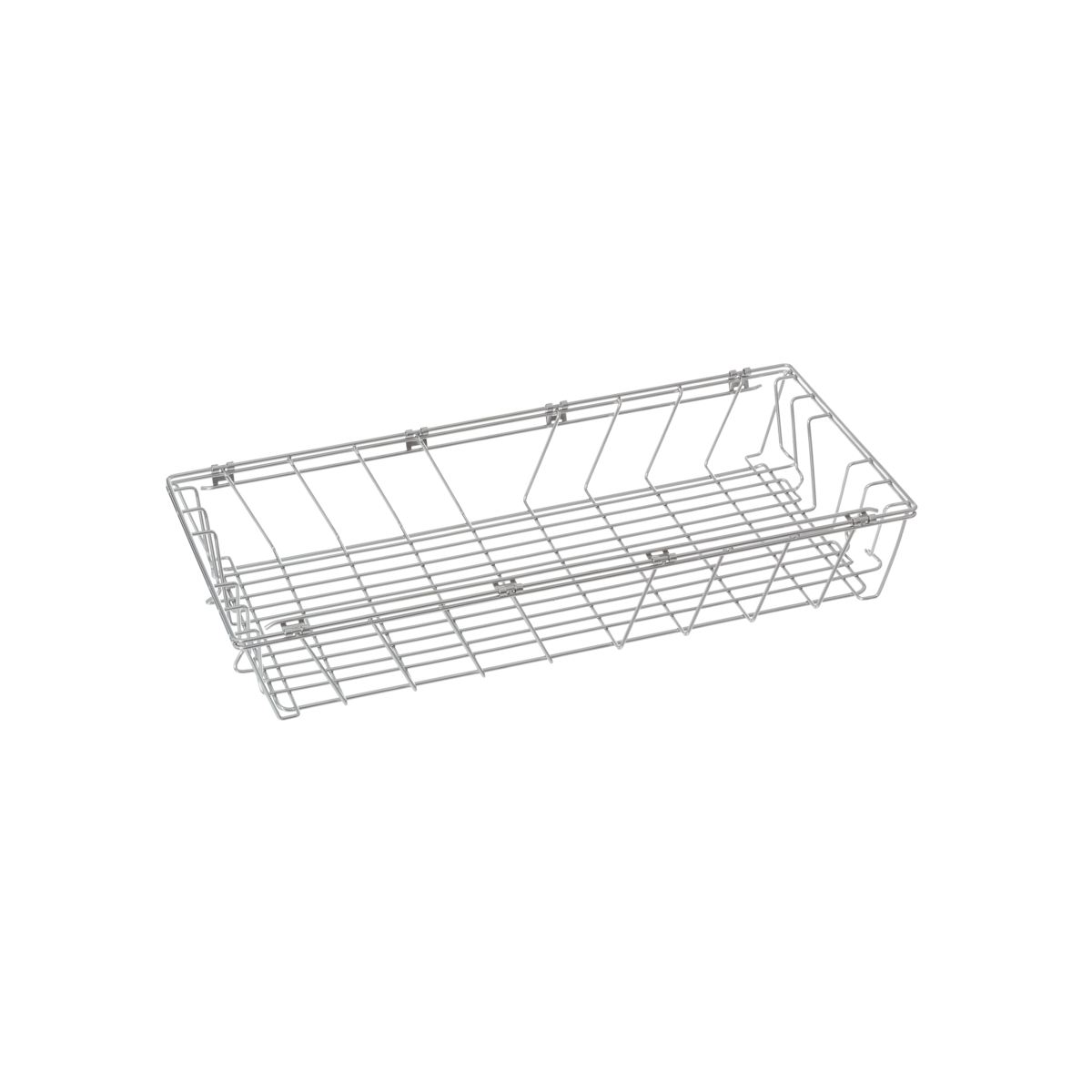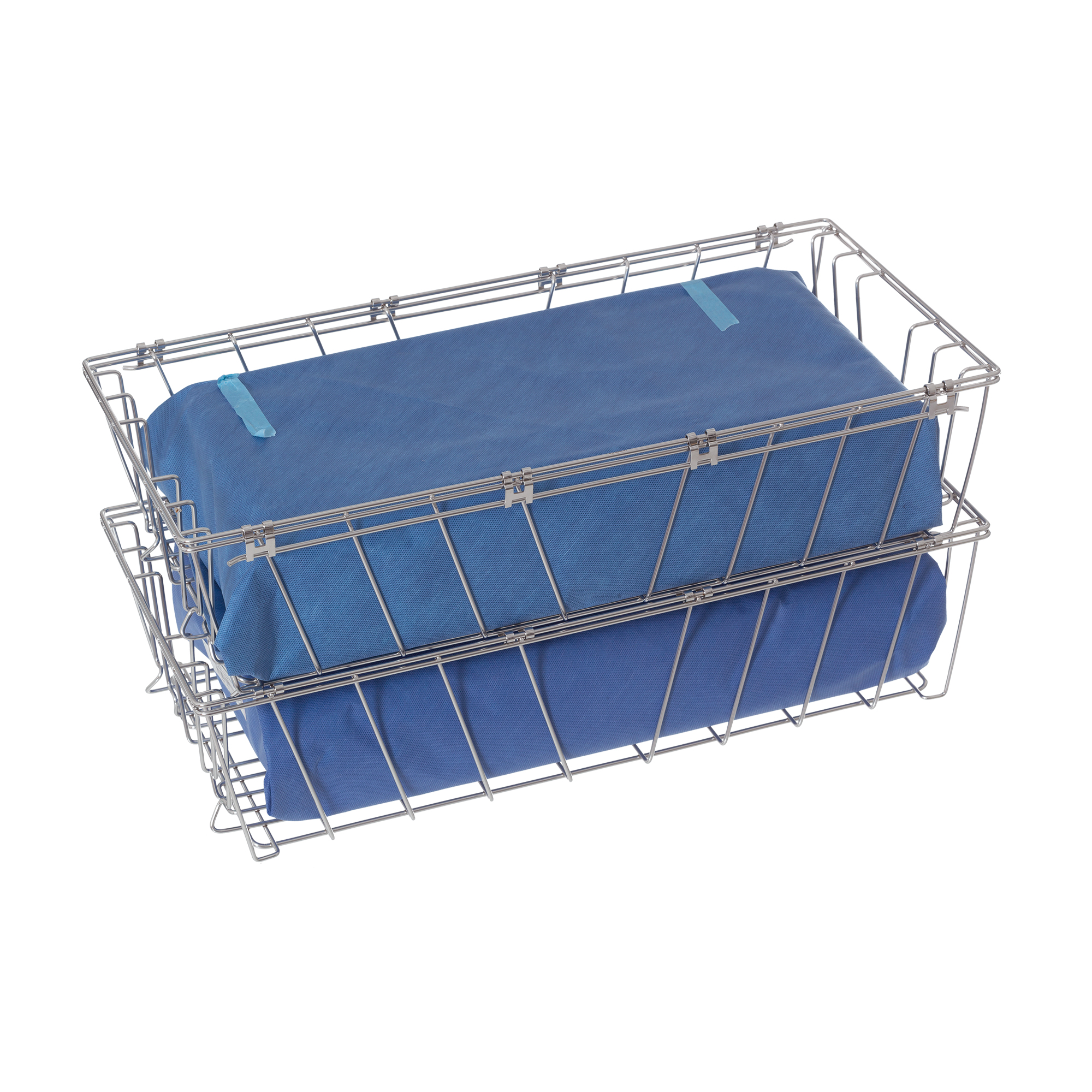 Korf geschikt voor wasinstallaties en geschikt voor sterilisatie, gemaakt van hoogwaardig elektrolytisch gepolijst roestvrij staaldraad. Door twee klapgrepen in lengterichting kunnen de korven naar keuze in elkaar (in lege toestand, bijv. in reinigings- en ontsmettingsapparaten) of op elkaar (in gevulde toestand) worden gestapeld. Klapgrepen dienen als glijrails voor een bijzonder ergonomische bediening bij het stapelen van de korven. Gelijktijdig wordt voorkomen dat de bovenop gestapelde korf door zakken de zachte verpakking in korf eronder beschadigt.