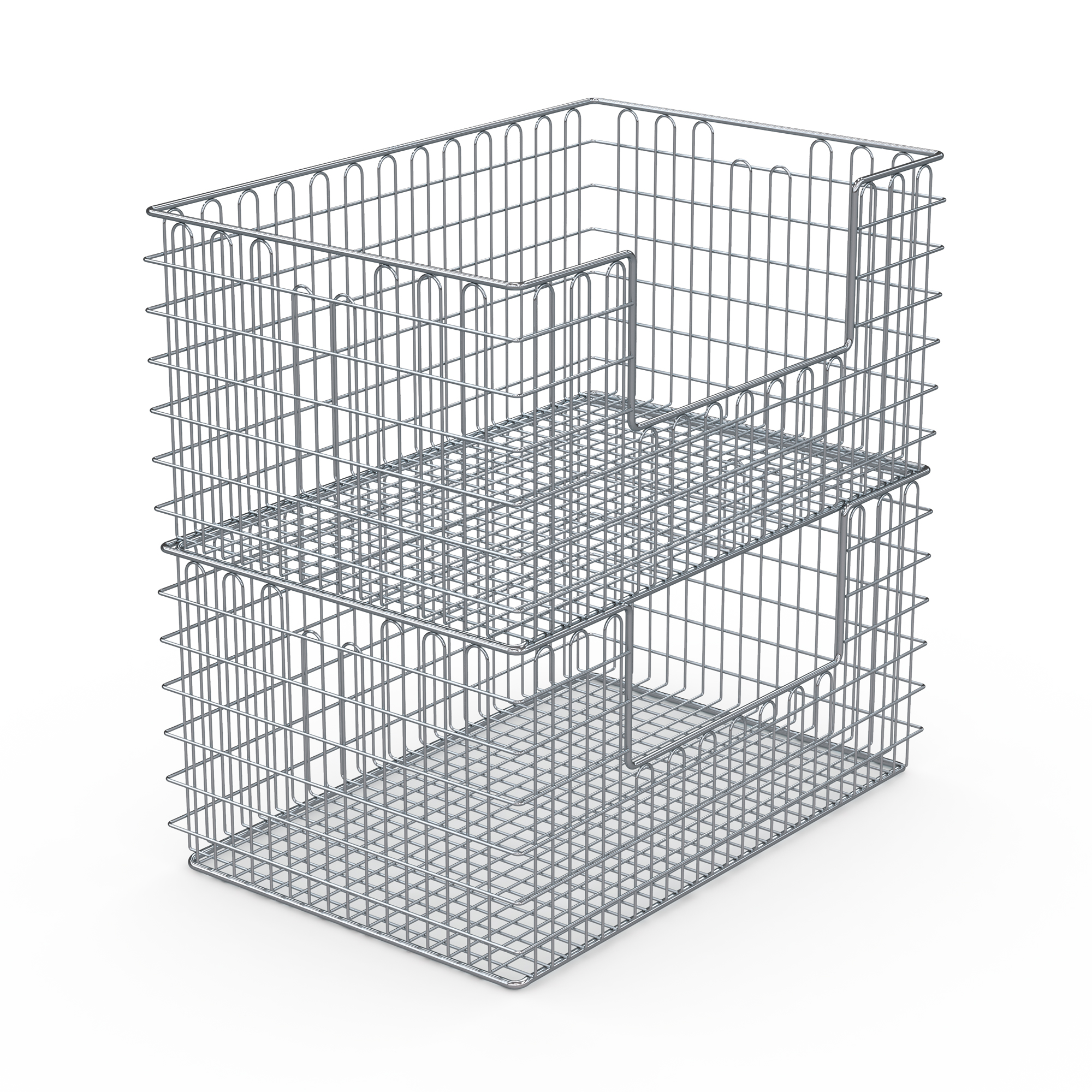 Draadmand in een uitvoering die geschikt is voor wasinstallaties en sterilisatie. Gemaakt van hoogwaardig, elektrolytisch gepolijst roestvrij rondstaal met gesloten draadlussen in de bodem en wanden.