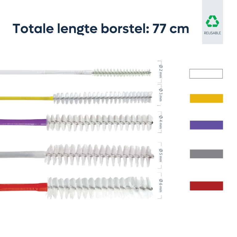Deze enkelzijdige, flexibele reinigingsborstel is beschikbaar in vele verschillende maten en afmetingen. De borstel is zowel reusable als single use beschikbaar. De totale lengte van de borstel bestaat uit de lengte van de borstel en het handvat samen.