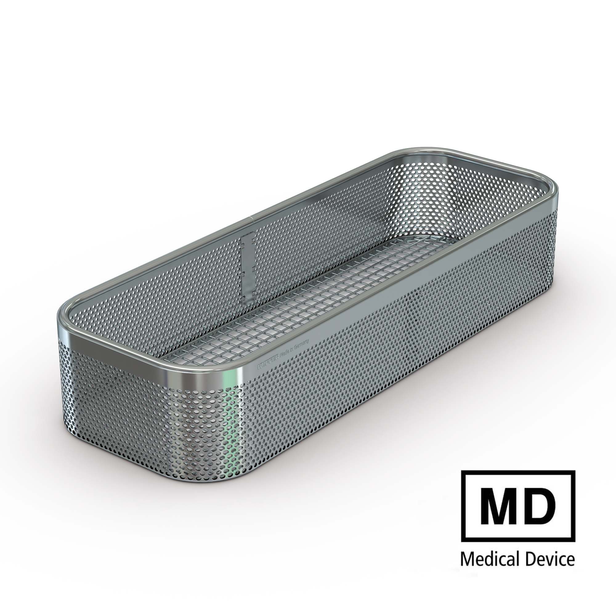 Zeefkorf iin reinigingsvriendelijke en hygiënische uitvoering van hoogwaardig elektrolytisch gepolijst roestvrij-rondstaal met wanden van fijn geperforeerde plaat en een bodem van gelast gaas.