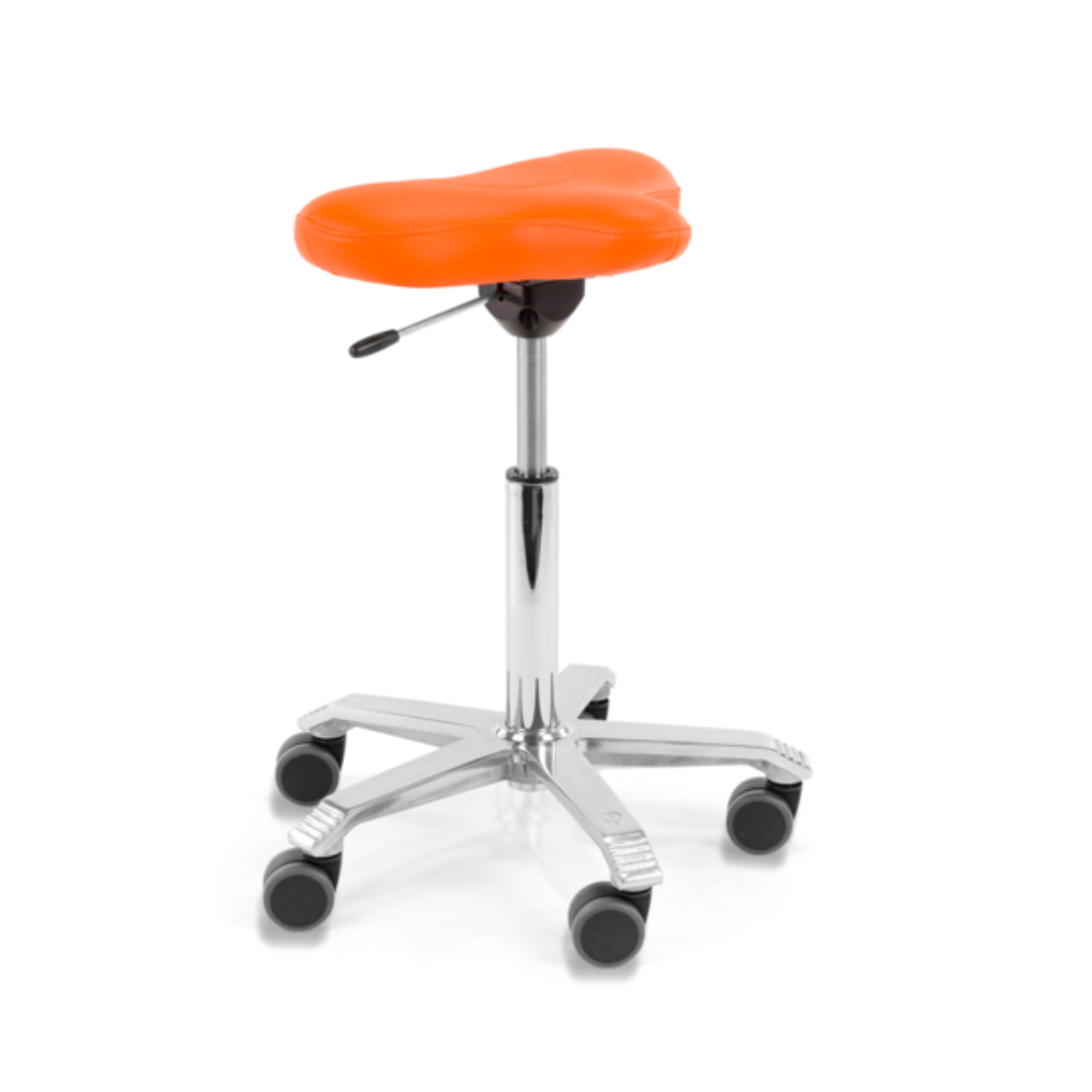 De zadelkruk is uitgevoerd met een fietszadel. Een erg handige en comfortabele kruk die overal ingezet kan worden. Beleef het comfort van een zadelkruk. De ergonomisch gevormde zadelzitting zorgt voor een juiste zithouding, terwijl de voeten stevig op de vloer staan. Door de zadelvorm komt de wervelkolom in een houding die minder tot vermoeidheid leidt. Ook bent u zeer beweeglijk op de zadelkruk, u rolt gemakkelijk van de ene naar de andere plek. De zadelkrukken zijn leverbaar in 3 verschillende zitvormen: De normale zitting, de bredere zitting en de smallere zitting.