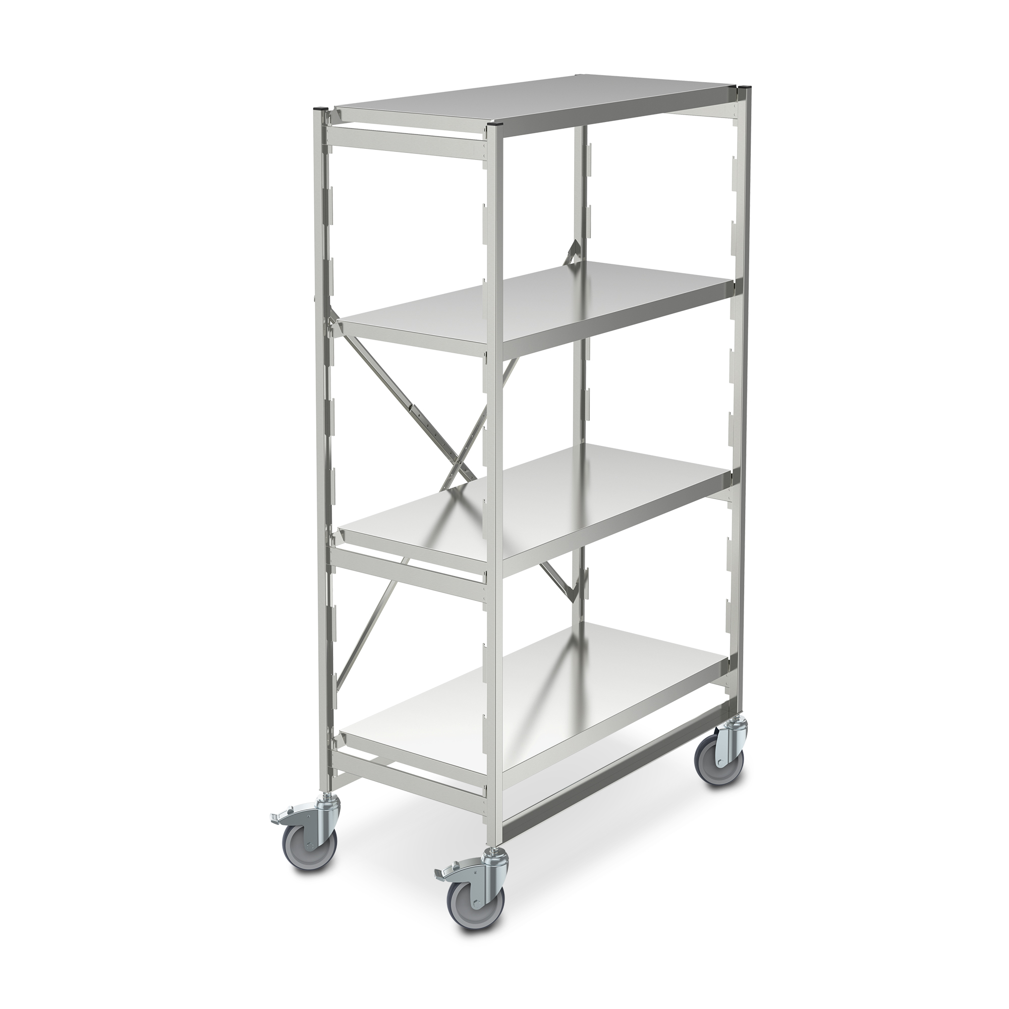 Staander van speciale vierkante buizen 25 × 25 mm, verbonden en gestabiliseerd door vastgeperste, dwars lopende staandersporten 40 × 7 mm. Bovenste afdekkappen van kunststof als hygiënische afsluiting van de staander. Geïntegreerde steunstrips in afstand van 150 mm voor het gemakkelijk inhangen van de legborden. Legborden in hygiënische en gemakkelijk te reinigende uitvoering.