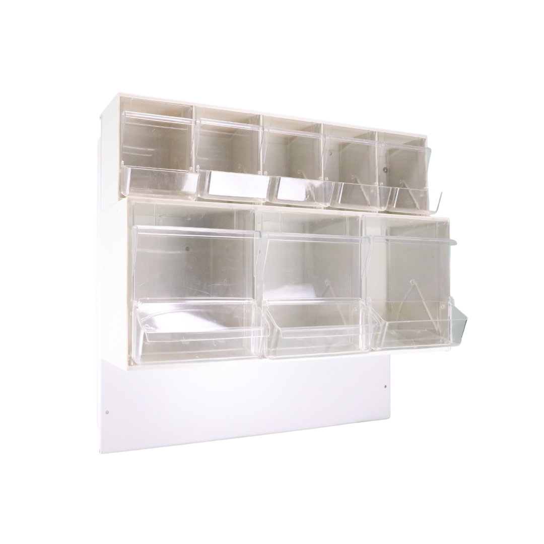 De bakjes zijn per rij verkrijgbaar met 3 grote bakjes, 4 middelgrote bakjes of 5 kleine bakjes. Er kunnen 3 rijen boven elkaar worden geplaatst om de opstand optimaal te benutten.