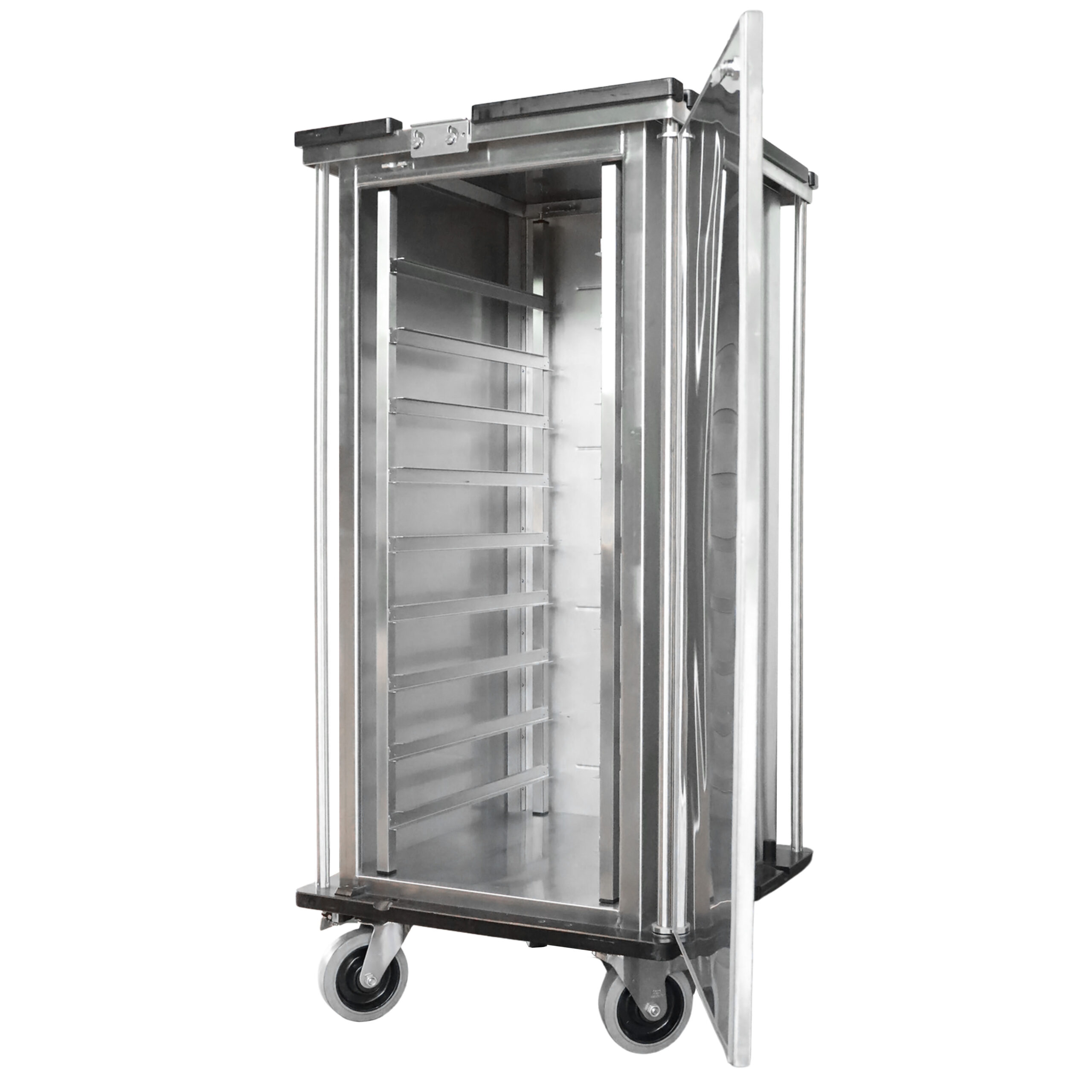 Transportwagen met enkelwandige, zelfdragende, stabiele roestvrijstalen constructie met speciaal geprofileerde achterwand en zijwanden.