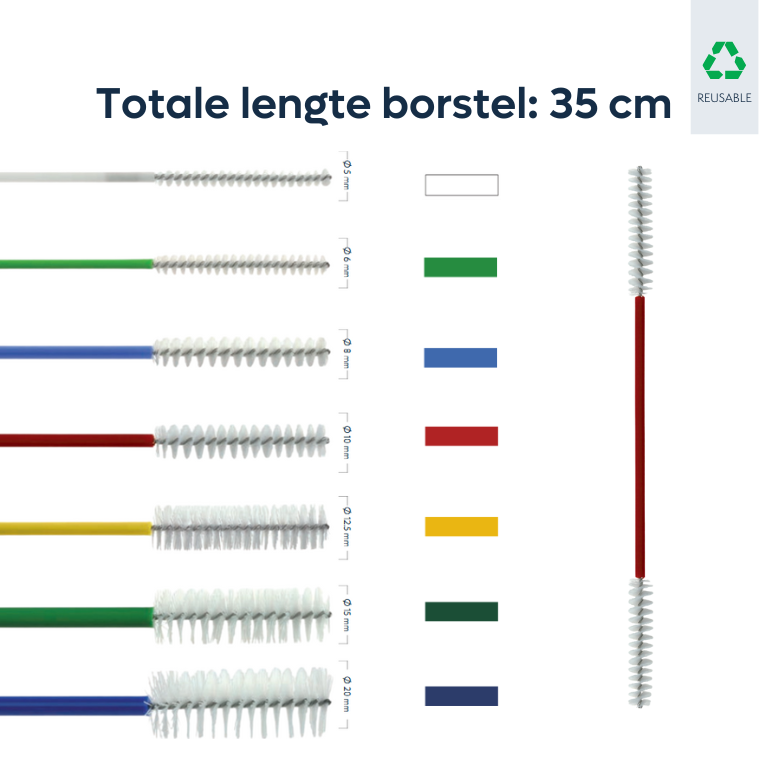 De borstel kan meerdere keren worden gebruikt. Doordat de uiteindes van deze borstel gesealed zijn, kan er geen water en/of ander vuil in de borstel achterblijven waarmee kruisbesmetting wordt voorkomen.