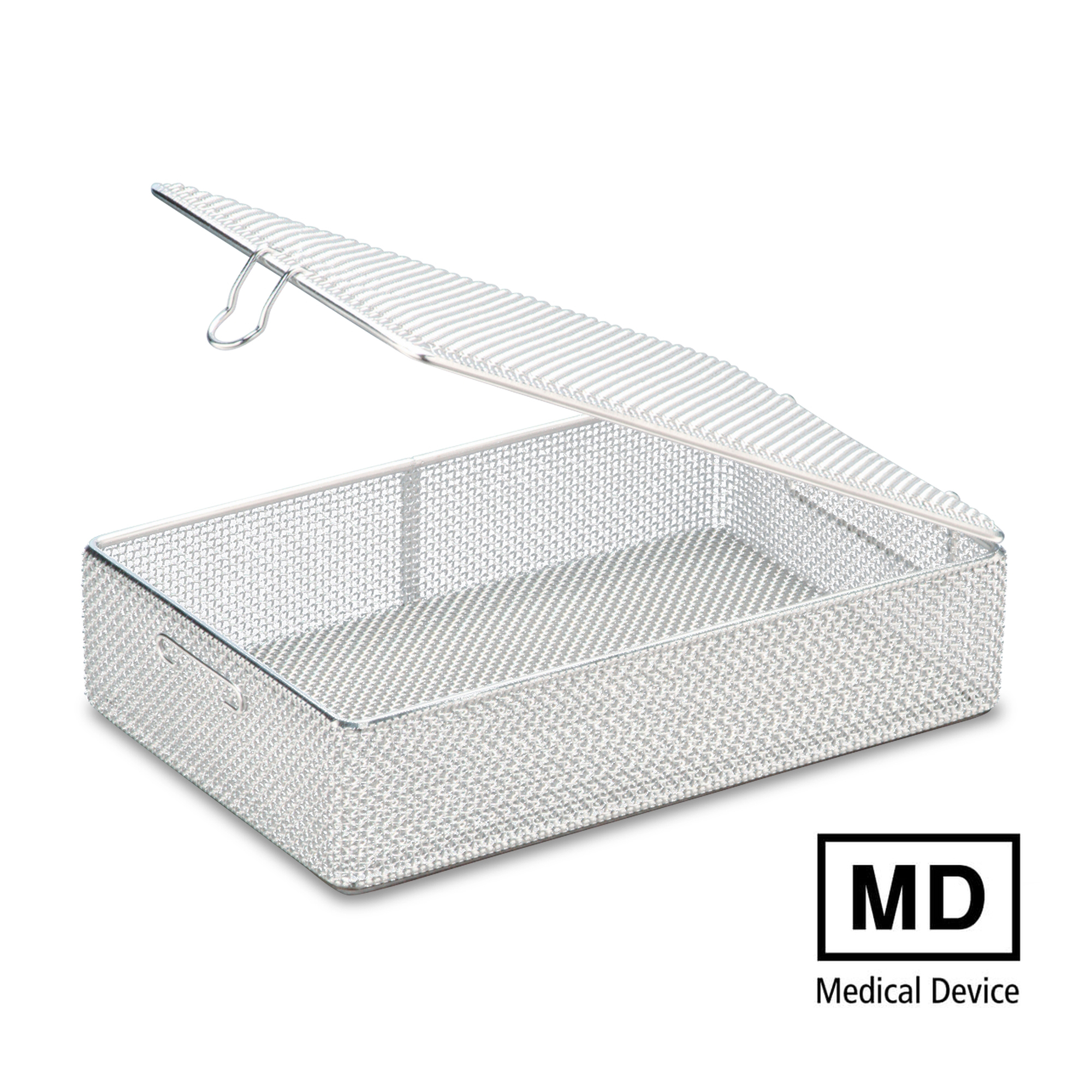Spoelkorf voor kleine delen en instrumenten, met vast gemonteerde deksel van hoogwaardig roestvrij draadstaal. Voor het opnemen van instrumenten, optica en toebehoren tijdens het reinigingsproces.