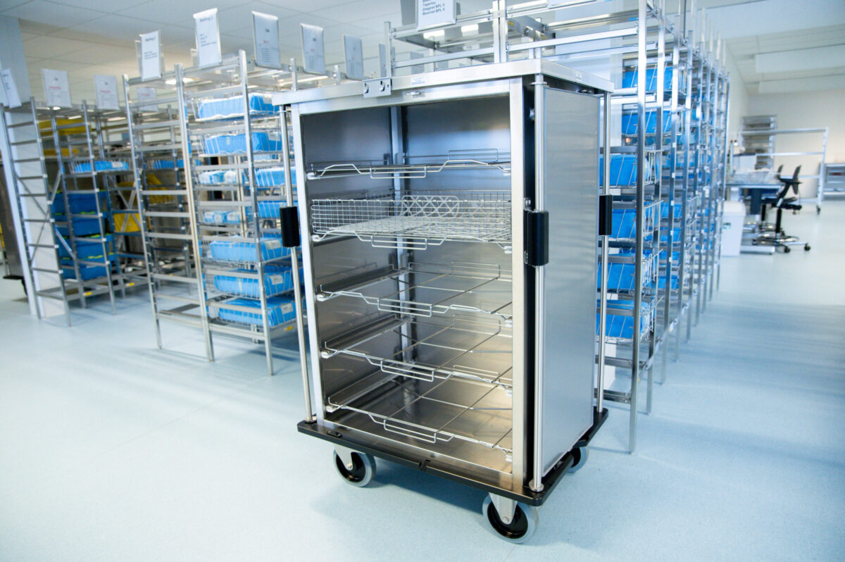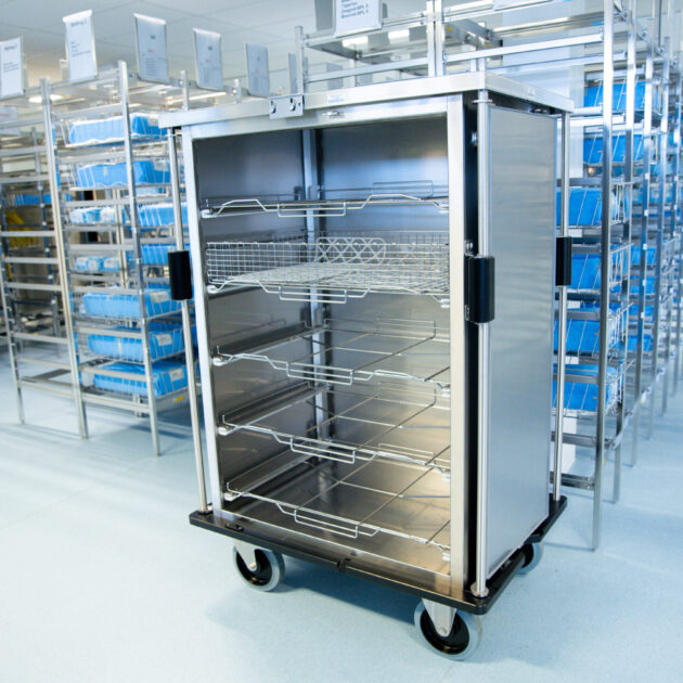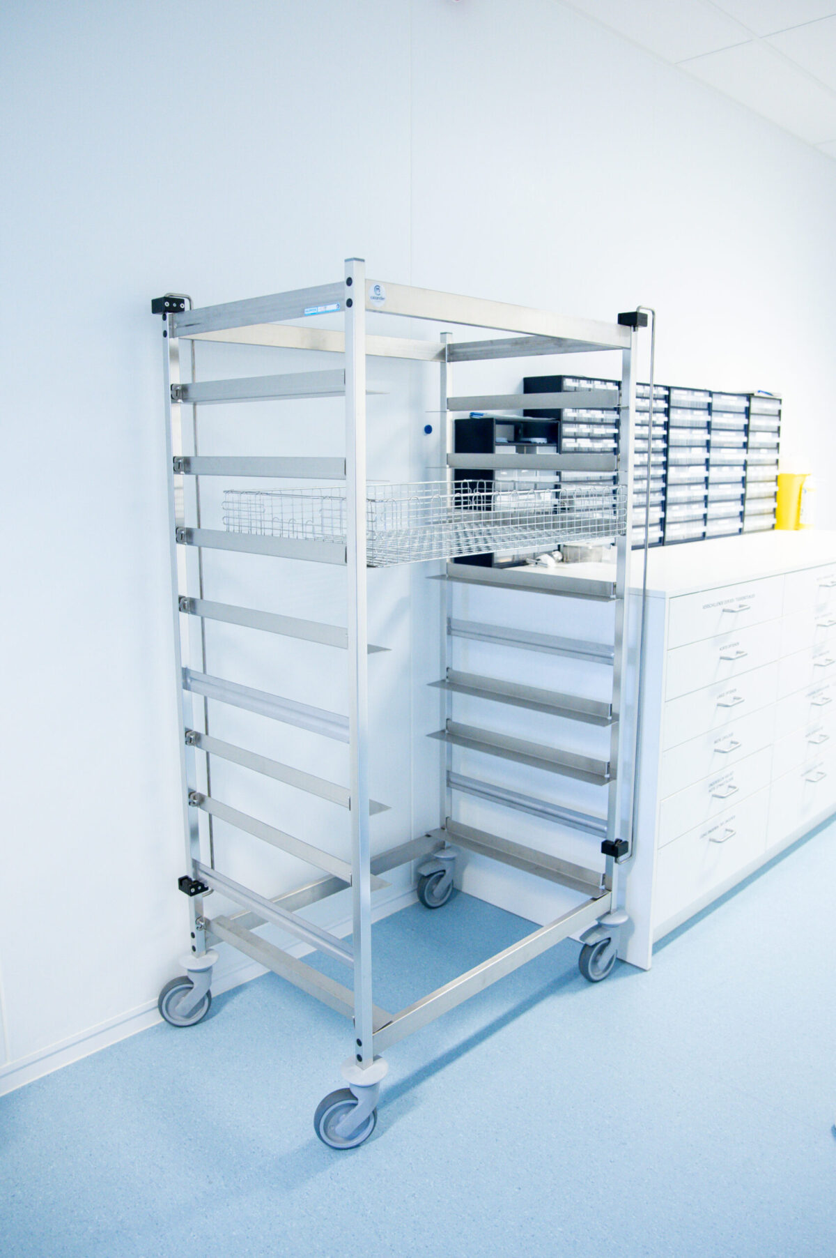 Uiteindelijk hebben we een speciaal systeem voor het Da Vinci®-instrumentarium kunnen aanschaffen. De bijbehorende manden, karren en stellingen zijn volledig afgestemd op de afmetingen en kwetsbaarheid van deze robotinstrumenten en sluiten daarom perfect aan. Dit systeem is exclusief bedoeld voor het transport en de sterilisatie van Da Vinci®-instrumenten; andere instrumenten mogen hierin dan ook niet worden verwerkt. De kar is bovendien duidelijk herkenbaar, waardoor iedereen direct weet wat de inhoud is. Deze investering draagt daarnaast aanzienlijk bij aan het behoud van de kwaliteit en levensduur van het instrumentarium.