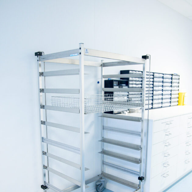Het gehele Da Vinci® systeem, bestaande uit draadmanden, transportkarren en stellingen, speciaal ontwikkeld voor het Da Vinci® instrumentarium.
